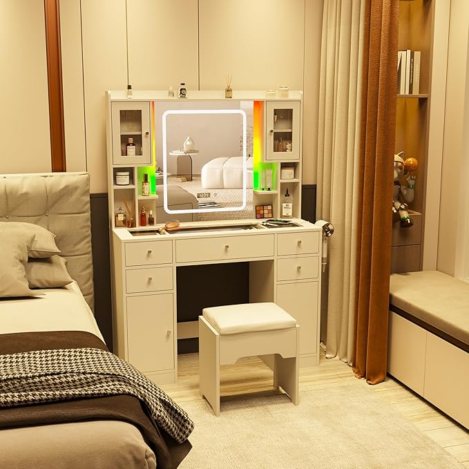 - [ GRB Colorful Ambient Vanity Lights ]: Our dressing table has a LED mirror with 3 different color lighting modes: warm yellow, warm white and cool white. You can easily change the color mode and brightness. And there also are 2 LED tubes on both sides of the mirror, can be controlled by mobile APP& remote control, have the music and timing options.