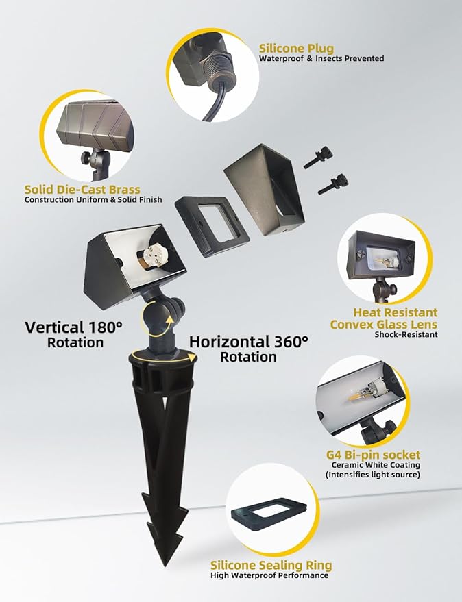 - EASY INSTALLATION: The floodlight has an adjustable cast brass knuckle with thumb screw and a ½" NPT threaded male hub on the bottom. The package comes with a PVC ground stake and 2 wire connectors. This floodlight comes with a 6-foot 18 AWG lead wire, which you can easy connect to an existing landscape system. A silicone plug at the lead wire exit prevents ground moisture from entering through the stem, reducing corrosion and increasing the fixture’s lifespan.