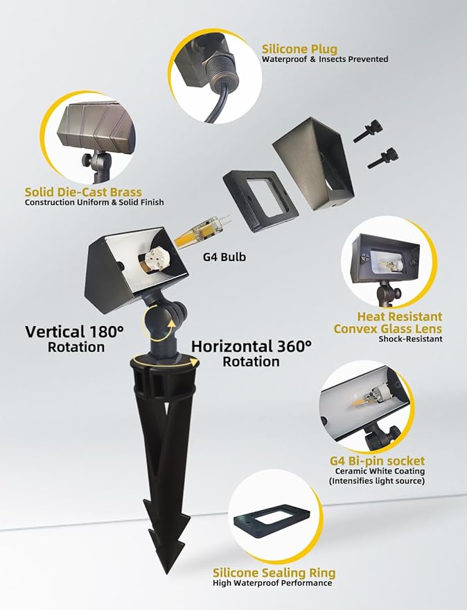 - Easy Installation: The floodlight has an adjustable cast brass knuckle with thumb screw and a ½" NPT threaded male hub on the bottom. The package comes with a PVC ground stake and 2 wire connectors. This floodlight comes with a 6-foot 18 AWG lead wire, which you can easy connect to an existing landscape system. A silicone plug at the lead wire exit prevents ground moisture from entering through the stem, reducing corrosion and increasing the fixture’s lifespan.