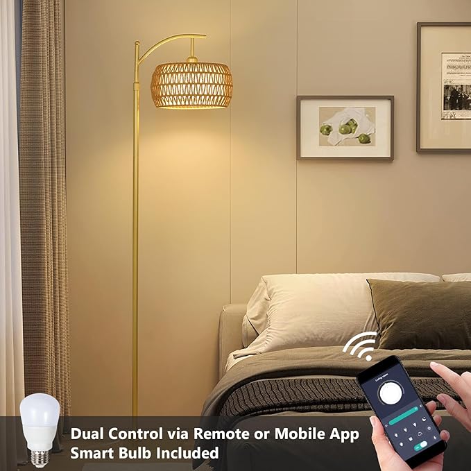 Arc Floor Lamp with 3 Color Temperatures, LED Gold Floor Lamp with Remote & Stepless Dimmable Bulb, Boho Standing Lamp with Rattan & Fabric Shades, Farmhouse Tall Lamp for Living Room Bedroom