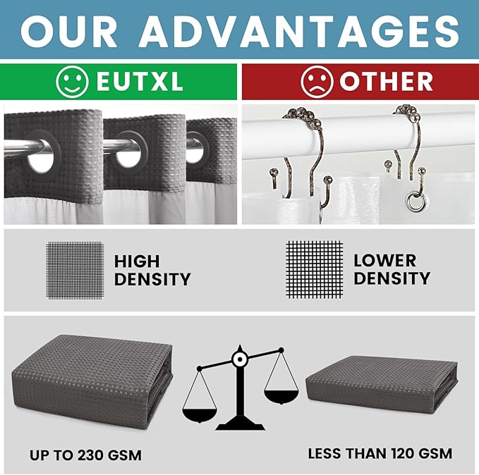 - 【Thick "Cotton" Type Fabric Shower Curtain】Made from expertly chosen and tested Heavyweight Polyester Fabric, touches like a cotton feel. 230GSM (Gram Per Square Meter), about 0.8 pounds heavier than normal 90GSM fabric shower curtains; Honeycomb waffle weave pattern adds elegance to your bathroom