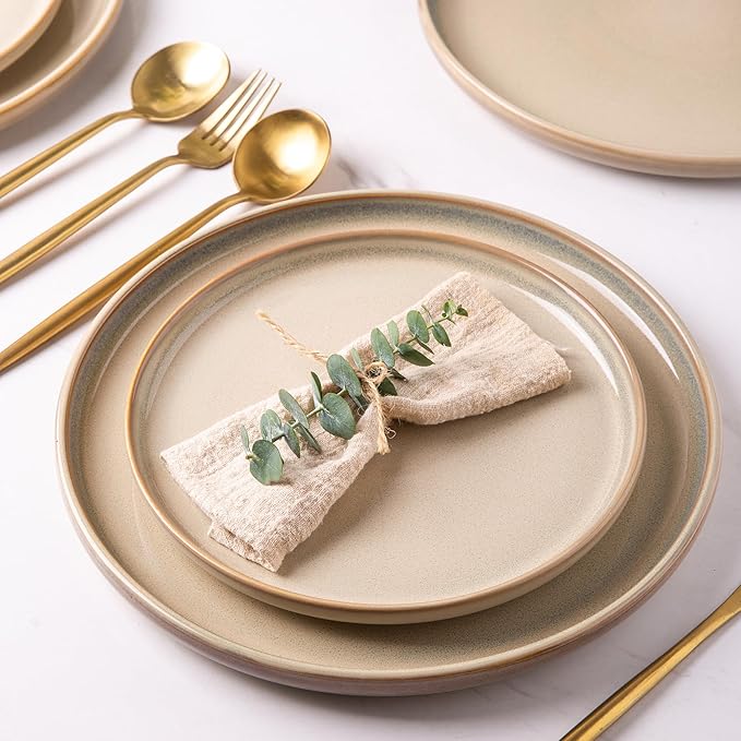 - EVERY PLATE IS UNIQUE: This dinerware set are fired with two different glazes, so the surface develops a beautiful color and makes your food looked even more delicious. The reactive glaze makes every plate unique. Since our glaze is all-natural, it tends to change color depending on the lighting. The color may be a tad different from what you see on your screen, but every item is beautiful.