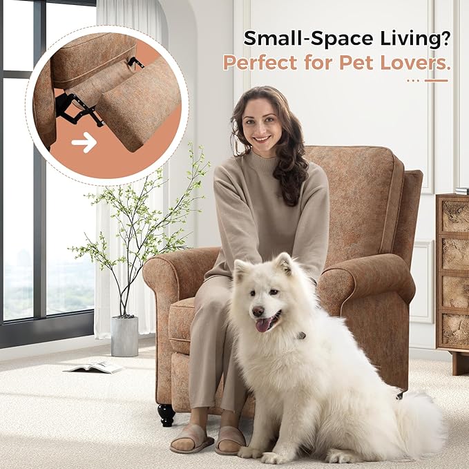 ANJ Push Back Recliner Chair, Textured Fabric Overstuffed Wingback Recliner, Adjustable Pushback Chair with Padded Seat and Back, Single Reclining Sofa for Living Room, Bedroom(Retro Brown)