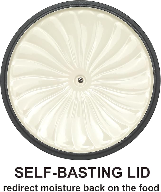 - ENCLOSED THERMAL CIRCLE: This enameled dutch oven pot is designed with a circular shower lid, the raised design of the lid makes the water vapor circulate in the pot, locks the food's nutrition and moisture, keeps the food's nutrition and moisture