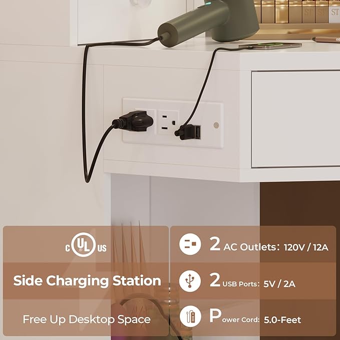 - VERTICAL POWER OUTLET: This makeup vanity comes with a charging station including 2 USB ports and 2AC outlet. Keep your devices and tools charged and handy while you get ready – convenience at its best! Vertical design also frees up your desktop space