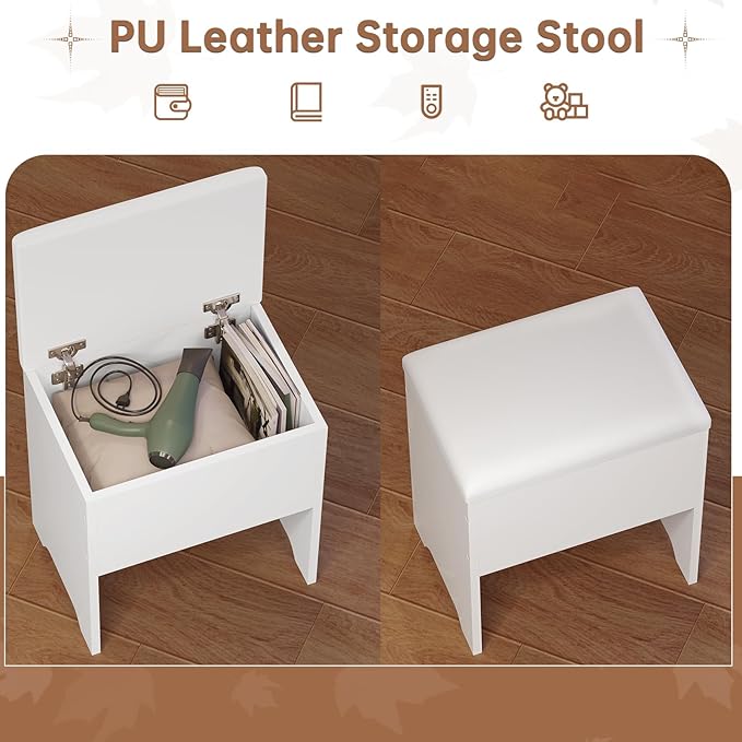 Vanity Desk with Mirror Lights, Storage Bench & Power Outlet, Corner Vanities with Rotating Cabinet & Drawers, 42.5" L Shaped Vanity Set, 3 Light Settings, for Women Girls, Modern White