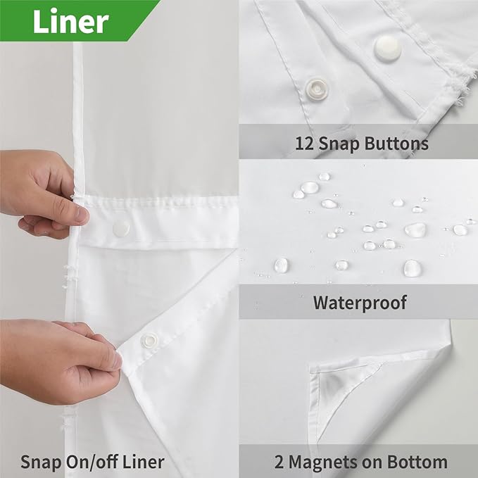 - 【Shower Curtain with Snap-On Liner】:This snap-on fabric shower curtain liner is easily detachable, making it convenient for cleaning or replacement.Equipped with 2 magnets at the bottom corners for added stability and to prevent splashing