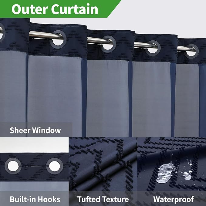 - 【Shower Curtain with Snap-On Liner】:This snap-on fabric shower curtain liner is easily detachable, making it convenient for cleaning or replacement.Equipped with 2 magnets at the bottom corners for added stability and to prevent splashing