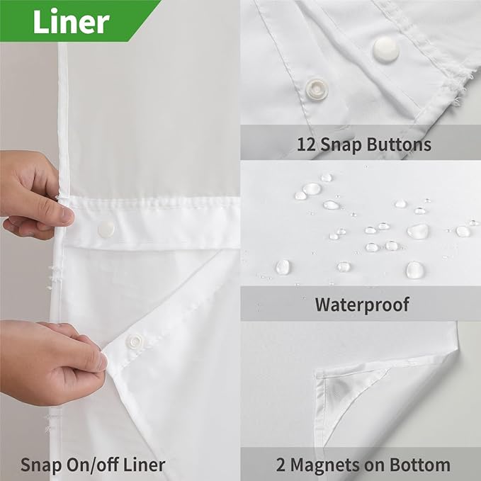 - 【Shower Curtain with Snap-On Liner】:This snap-on fabric shower curtain liner is easily detachable, making it convenient for cleaning or replacement.Equipped with 2 magnets at the bottom corners for added stability and to prevent splashing