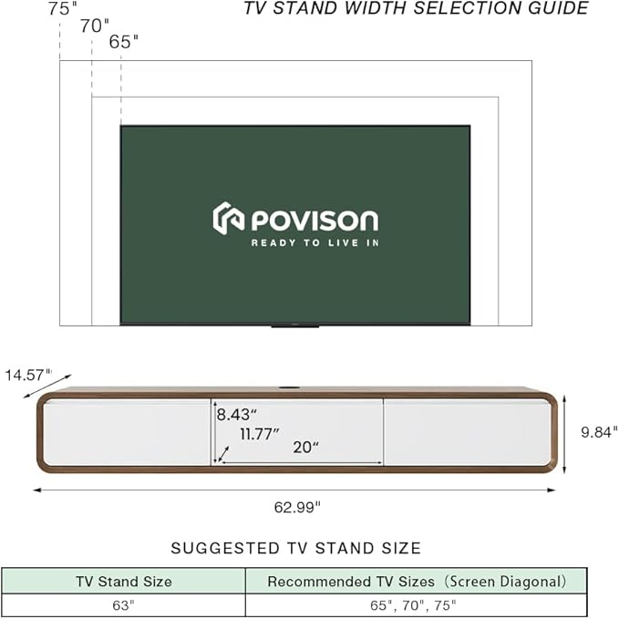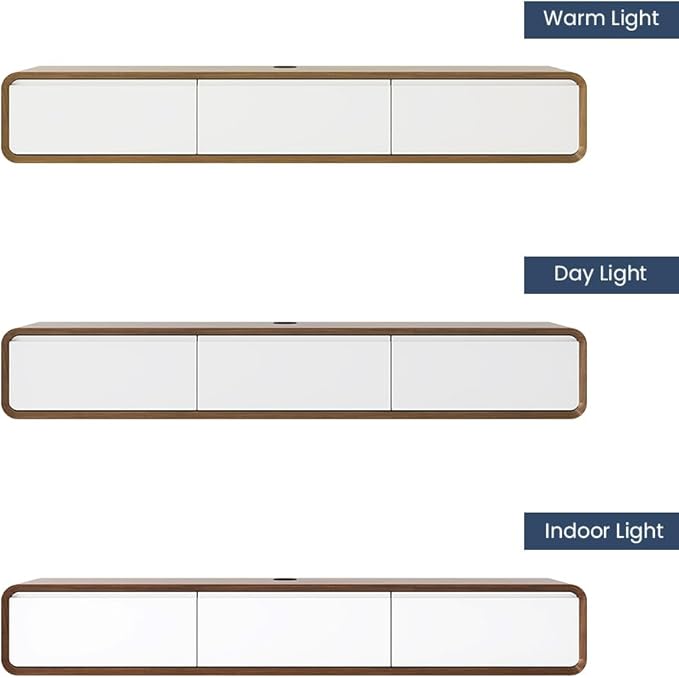 POVISON Fully Assembled Floating TV Stand with Flip-Down Cabinet Doors, 63" Walnut and White Floating Media Console, Solid Wood Floating Entertainment Center, Minimalist TV Stand