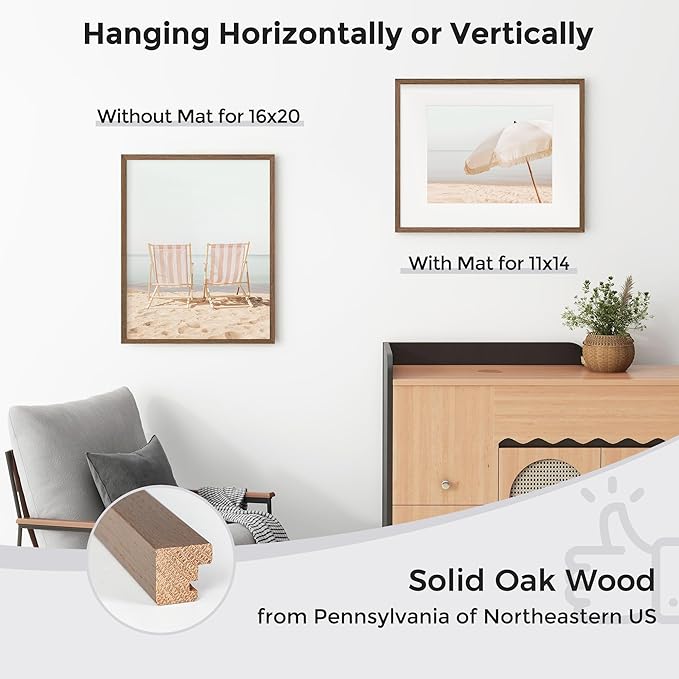 - Highest Quality OAK Materials: Our 16'' by 20'' natural wood frame made of 100% white oak wood, comes from Pennsylvania of Northeastern US, is the most widely used timber;because the excellent texture, long-lived durable characteristics, becomes the one of the most popular woods in home decor, and due to the grain pattern, suitable various kinds of decoration style