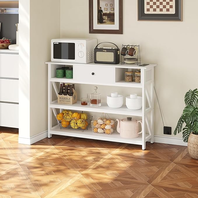 Mexin 39 Inch Console Table with 2 Outlet and 2 USB Ports, Entryway Table with Drawer and Storage Shelves, Narrow Sofa Table for Living Room and Hallway, White