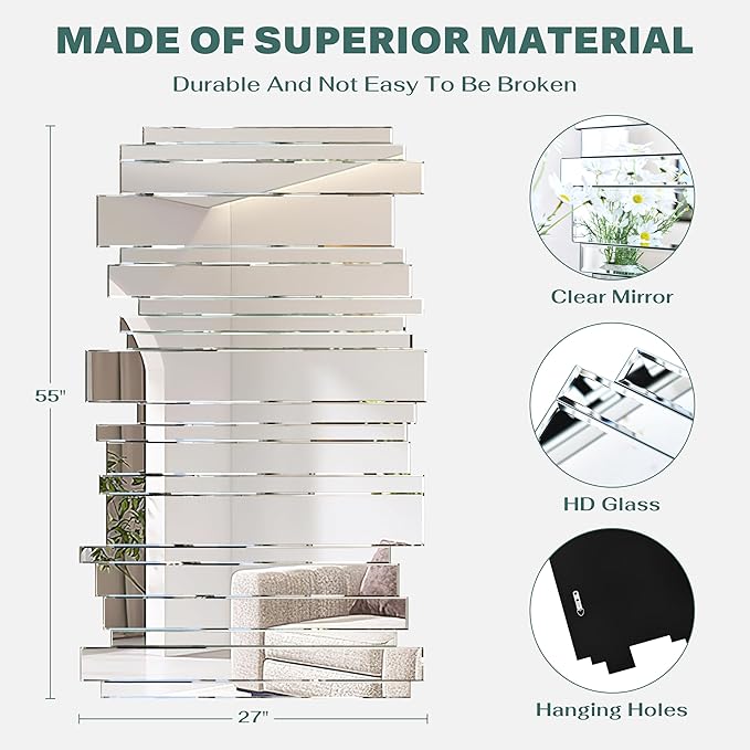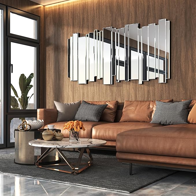 - SPECTACULAR DESIGN:Some glass strips of different sizes interlock with each other to form this very distinctive wall mirror. The smooth edges of strips are hand polished to ensure safety