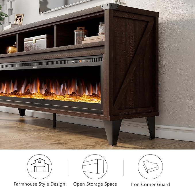 65“ Farmhouse Fireplace TV Stand, Industrial Entertainment Center with 60" Tempered Glass Electric Fireplace, Media Console with Open Storage Space for TVs up to 75", Espresso