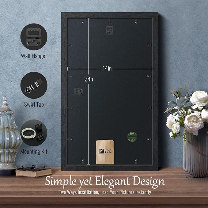 - PRODUCT FEATURES: The overall size is 15.8”x25.8” for Pictures 14x24 or 24x14, horizontal/vertical for table or wall display. Unlike others, special swirl tabs make the frame super easy to load pictures.