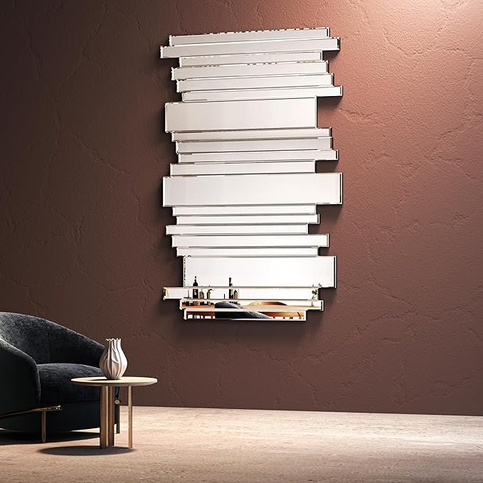 - SPECTACULAR DESIGN:Some glass strips of different sizes interlock with each other to form this very distinctive wall mirror. The smooth edges of strips are hand polished to ensure safety