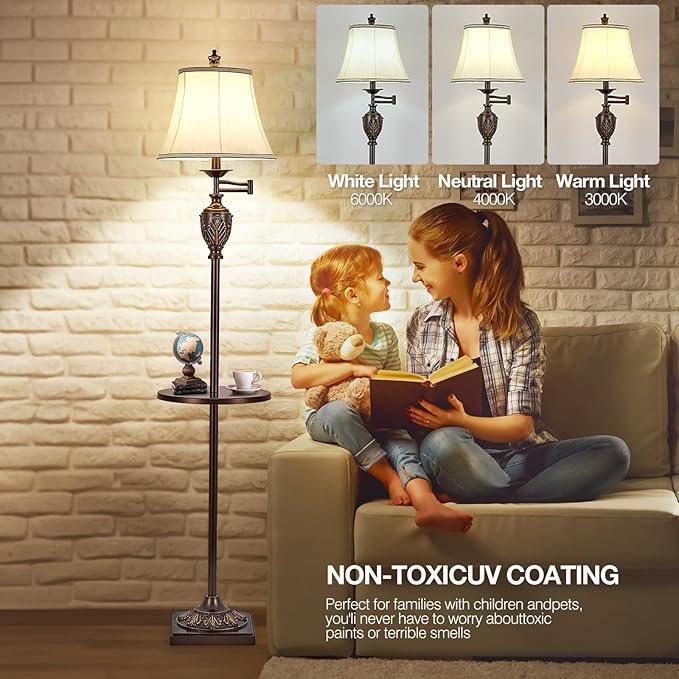 - TABLE AND ELEGANT LAMPSHADE-- We upgraded the Lamps,The middle part of the floor lamp has added a tray for you to place your belongings, or put a cup of coffee in the leisure time is also good. The lampshade is made from durable faux silk fabric, which makes the light soft, eye friendly and is easy to clean.