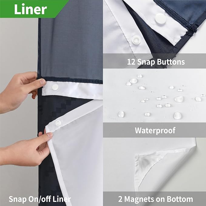 - 【Shower Curtain with Snap-On Liner】:This snap-on fabric shower curtain liner is easily detachable, making it convenient for cleaning or replacement.Equipped with 2 magnets at the bottom corners for added stability and to prevent splashing