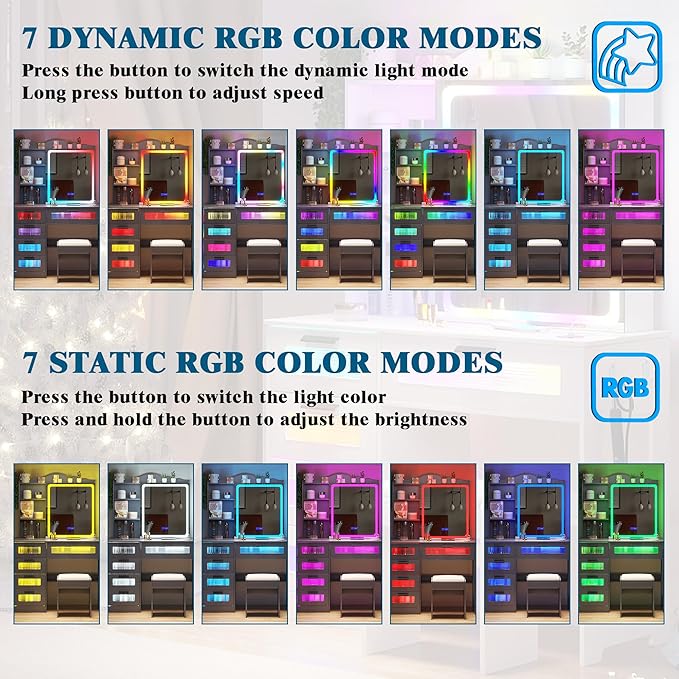 - ✅【Dancing RGB lights】The modern vanity has 7 kinds of dynamic and static lights. In the dynamic mode, short press can change the light color, and long press can adjust the speed. In static mode, short press can switch the light color, and long press can adjust the speed. In addition, we are also equipped with a remote control to allow you to change the light color you want at any time