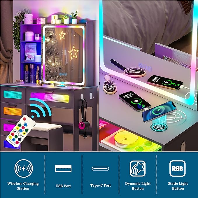- ✅【3-IN-1 Charging Station】Our vanity table provides you with a wireless/USB/type-c charging station, no need to worry about wire entanglement, you can fully charge your electronic devices at any time, convenient and fast