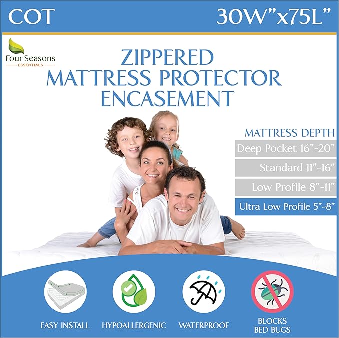 Cot Size Waterproof Mattress Protector (30" Wx75 L) - Waterproof Zippered Encasement Premium Quality Bed Cover Protects Against Dust, Allergens White