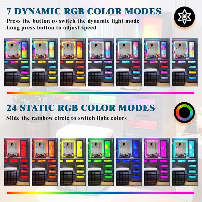 - 🍬【Colorful Lights】This vanity set with a total of 24 static lights and 7 dynamic lights is perfect for festivals, events, parties, performances and exhibitions, making your party the highlight.