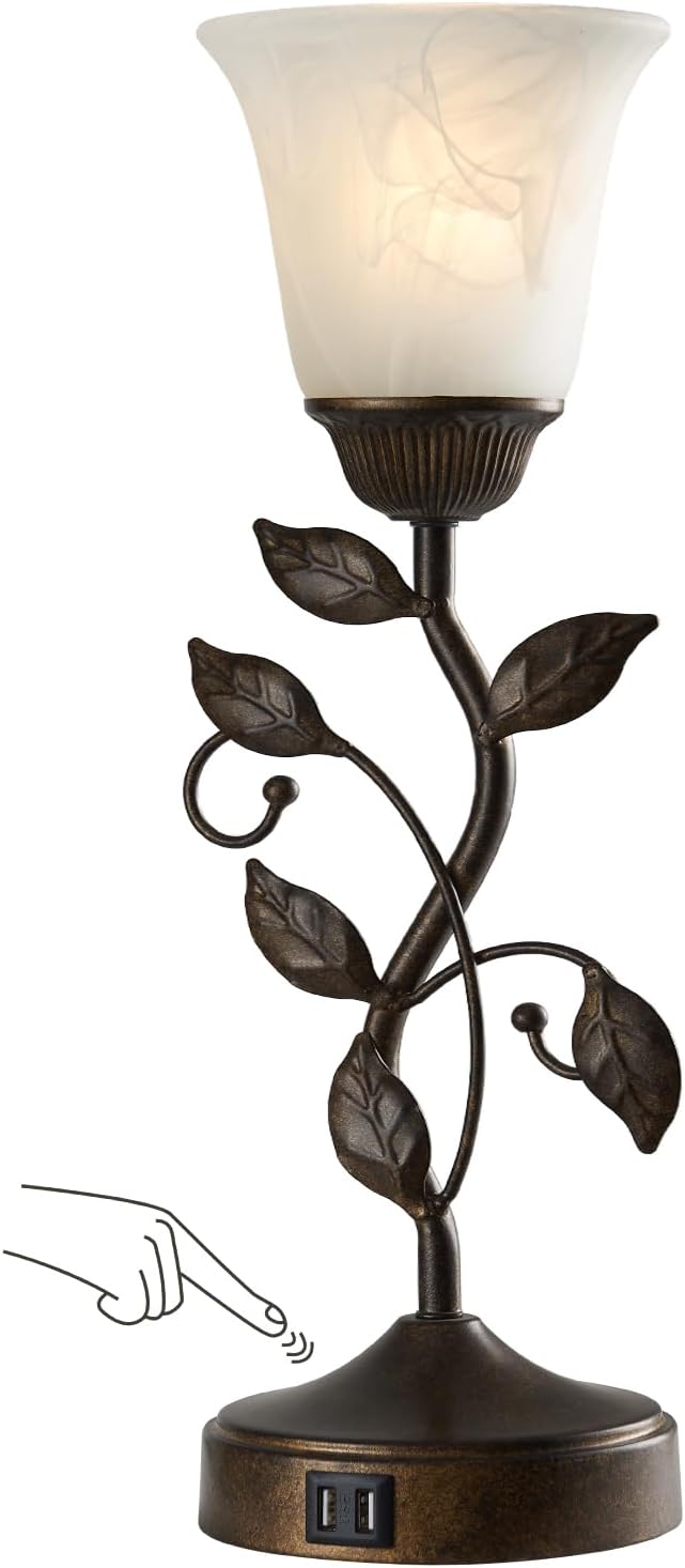 RORIANO Touch Bedside Table Lamp, Vintage Nightstand Lamp with 2 USB Ports for Living Room, 3 Way Dimmable Leaf Lamp Retro Table Lamp for Bedroom with White Glass Shade, LED Bulb Included