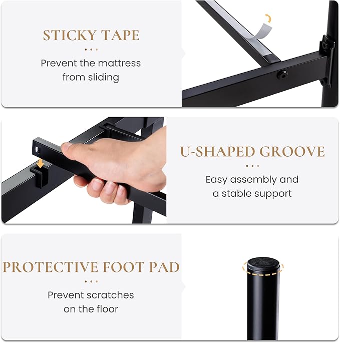 - Noise-Free: The black bed frame provides an EVA sponge to help cushion the contact between slats and reduce potential noise caused by friction. Greatly improve the quality of sleep by minimizing disturbances from creaking or rattling sounds