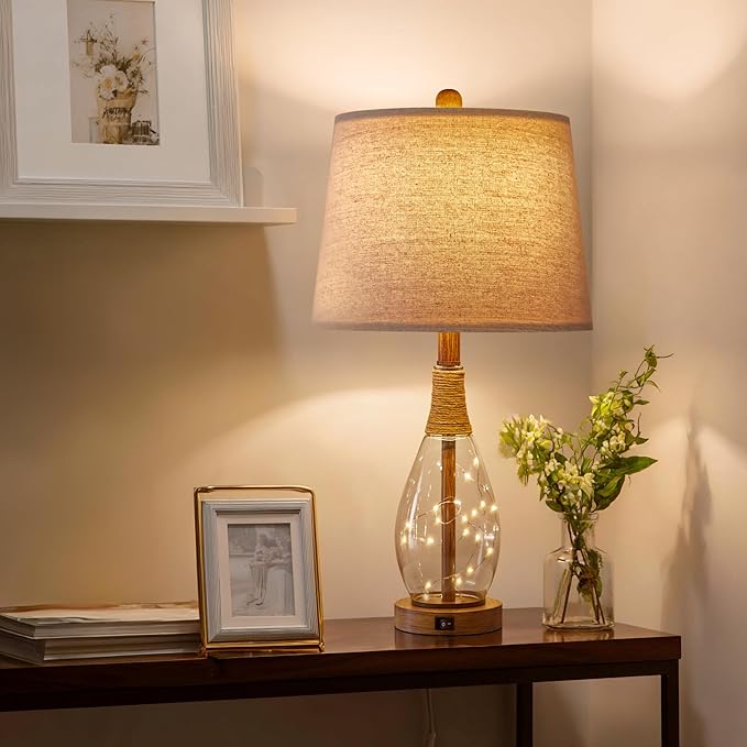 - For Your Loved One: Unique glass table lamps, linen fabric lampshades and high-quality resin wood lamp holders add a romantic and warm atmosphere to your living room, rattan wrapped design on the modern table lamp holder and the glass lamp body of the drip-shaped built-in nightlight make the lamp even more unique.
