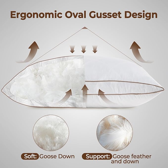 - 【Oval Gusset Design】Those oval gusset goose down feather pillow ensures enough filling in the middle part to maintain its shape, offer maximum comfort for any sleeping position. Ideal for side sleepers, stomach and back sleepers for all season use.