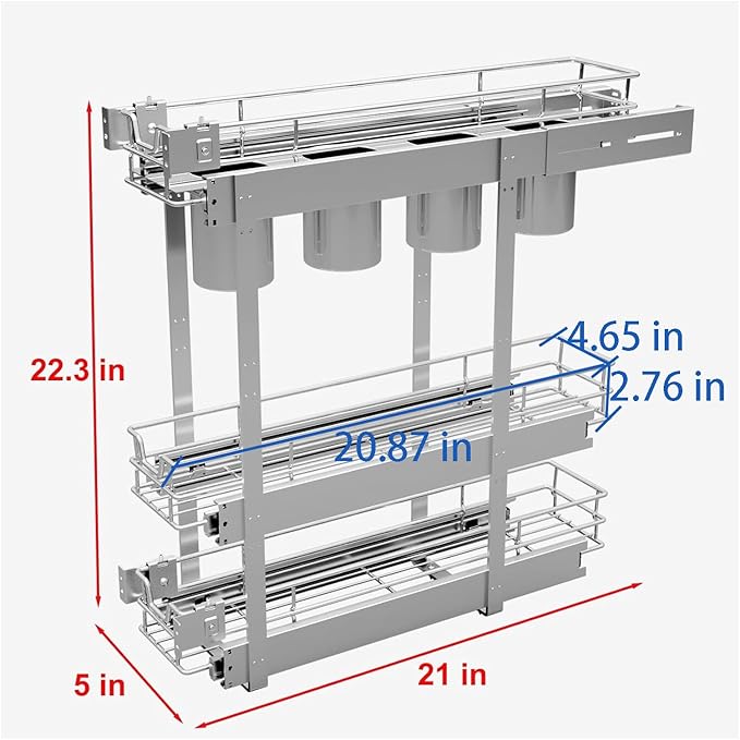 - NOTE: Measurements are overall pull-out cabinet organizer dimensions, hinges and Slide included!!!! Practical use dimensions are slightly smaller than the overall dimensions.