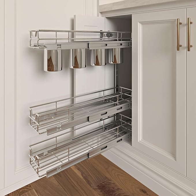 - NARROW DESIGN FOR EDGE CABINET SPACE: Use this 3 Tier Individual Pull-Out Cabinet Organizer, you can fully utilize the narrow cabinet space. Perfect for storing small kitchen utensils, spices and canned accessories.