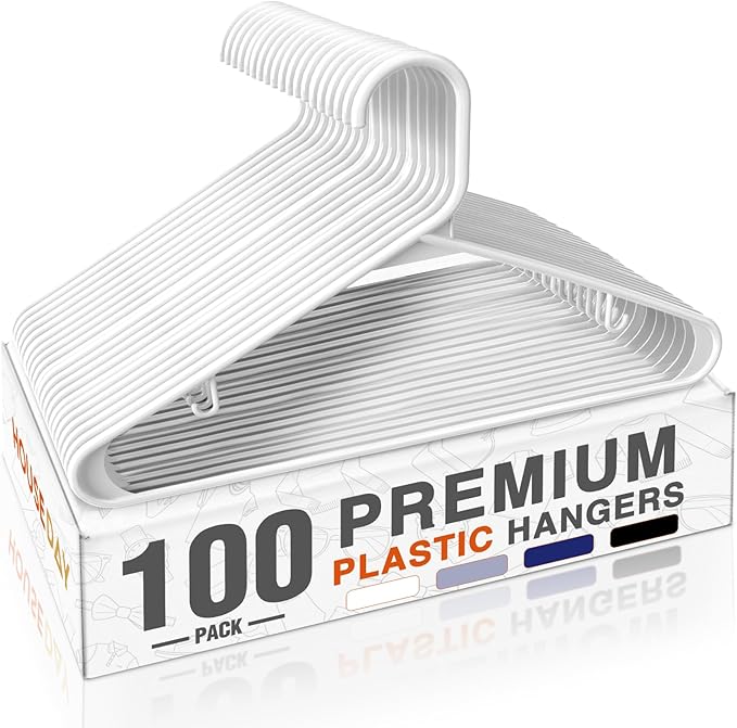 HOUSE DAY White Plastic Hangers 100 Pack, Plastic Clothes Hangers with Built-in Hooks, Durable and Strong Coat Hangers for Closet, Space Saving Clothing Hanger for Shirts, Coats, Skirt, Dress