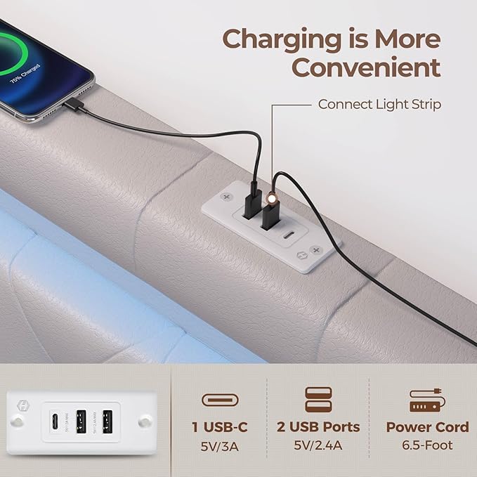 - Adjustable LED System with USB and Type C Ports: Effortlessly control it via remote or app. Choose from over 60,000 colors to set the ideal mood for any music genre. Sync the lights to the music for a dynamic party vibe. It also doubles as a charging station for your phone, ensuring it stays powered while you relax in bed. Tip: Once the light strip is installed, kindly connect the cable to the USB port.