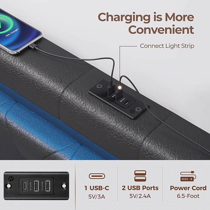 - Adjustable LED System with USB and Type C Ports: Effortlessly control it via remote or app. Choose from over 60,000 colors to set the ideal mood for any music genre. Sync the lights to the music for a dynamic party vibe. It also doubles as a charging station for your phone, ensuring it stays powered while you relax in bed. Tip: Once the light strip is installed, kindly connect the cable to the USB port.
