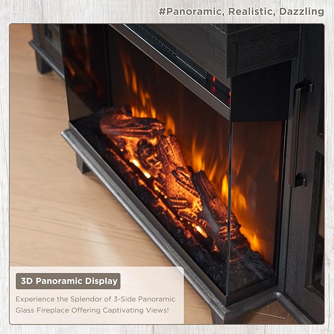 - Excellent Ambience Creator: This 26" oversized panoramic electric fireplace features a 3-sided tempered glass display, enjoying the brilliant 3D dancing flames from any seat in the room. The realistic log set and ember bed present 3 flame colors plus a cycling mode, combined with the RGB illumination inside the cabinet and distinctive hollowed-out design on 3-sides, be it immersive gaming or vibrant party nights, effortlessly craft the perfect atmosphere in sync with your emotions.