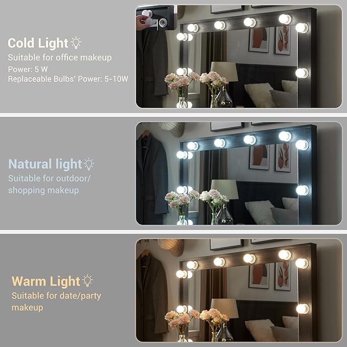 - Hollywood Makeup Mirror : Equipped with three types of lighting for the perfect makeup application(warm white & cold White & warm yellow), ensuring you look flawless every time.