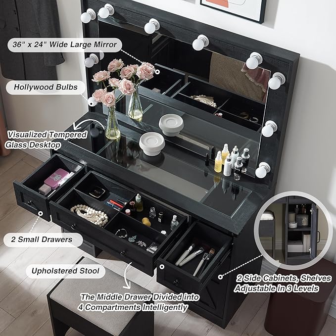 JXQTLINGMU Farmhouse Vanity Desk with Hollywood Makeup Mirror - Ample Storage Space with 3 Drawers & 2 Cabinets - Detachable Light Bulbs, Stool Included, Bedroom, Black
