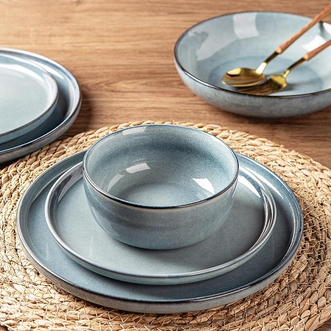 - EVERY PLATE IS UNIQUE: This dinerware set are fired with two different glazes, so the surface develops a beautiful color and makes your food looked even more delicious. The reactive glaze makes every plate unique. Since our glaze is all-natural, it tends to change color depending on the lighting. The color may be a tad different from what you see on your screen, but every item is beautiful.