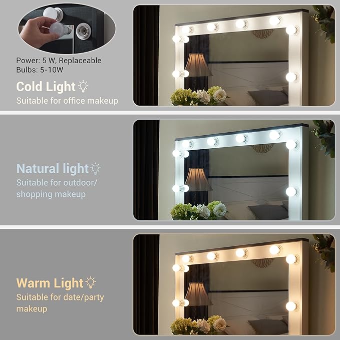 - Hollywood Makeup Mirror :Equipped with three types of lighting for the perfect makeup application(warm white & cold White & warm yellow), ensuring you look flawless every time.