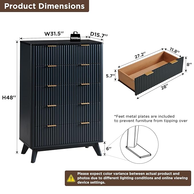 - Versatile, Stylish Dresser: Measuring 31.5"W × 15.75"D × 48"H, this versatile dresser offers an array of possibilities for your home organization. It features 5 smooth-glide drawers, each measuring 27.2"W × 12"D × 8"H, offering efficient storage solutions. Keep your space clean and organized by conveniently stowing clothing, bedding, cosmetics, jewelry, and more. Suitable for various spaces, including the bedroom, living room, hallway, entryway, and more.
