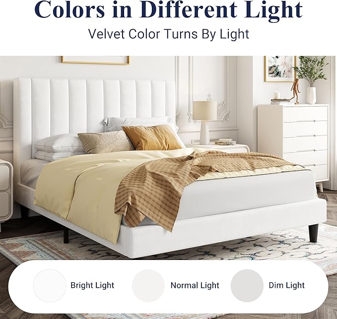Allewie Queen Bed Frame/Velvet Upholstered Bed Frame with Vertical Channel Tufted Headboard/Strong Wooden Slats/Platform Bed Frame/Mattress Foundation/Box Spring Optional/Easy Assembly/White