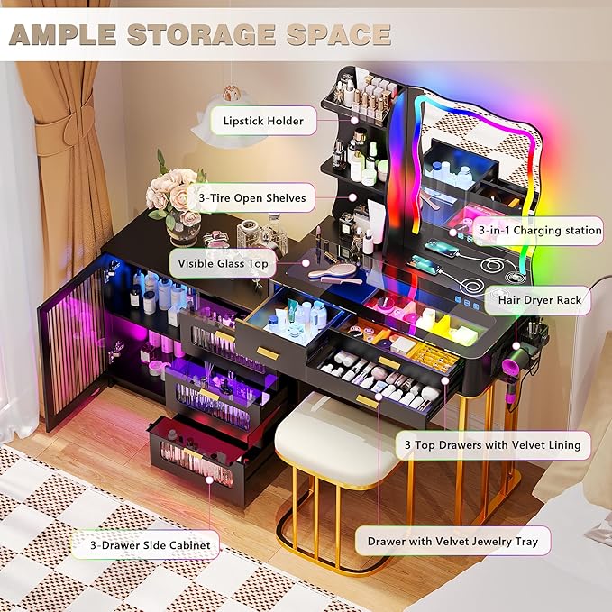 RGB Makeup Vanity Desk with Wireless Charging Station,7 Dynamic and 7 Static Dimmable Vanity Table with Glass Desktop,Vanity Mirror with Lights Desk and Chair,8 Drawers,Stool