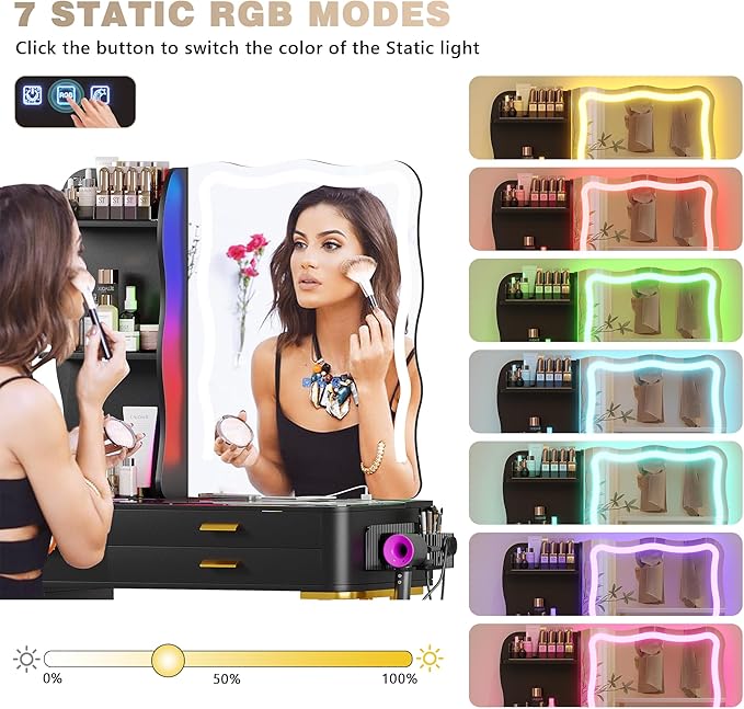 - 【Amazing RGB/LED Lights Modes】The vanity comes with 7 static modes and 7 dynamic modes for you to create a super cool makeup videos.RGB button can switch 7 colors of light, and long press the switch to adjust the brightness.Anther button can switch the mode of dynamic lights.