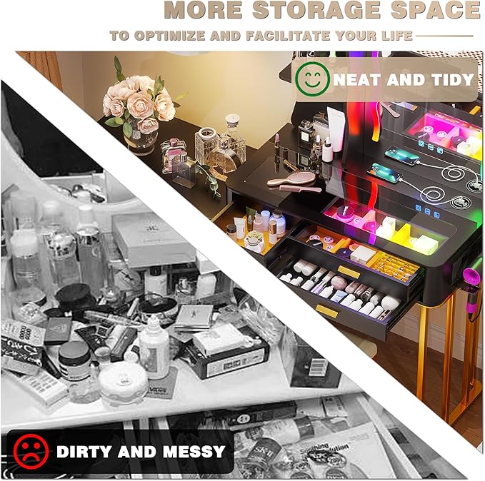 - 【Modern Design】We added light strips to the open shelves and drawers (the first drawer of the main table) and side cabinets, plus the side cabinet doors are made of acrylic, and when you turn on the light mode, the whole vanity glows with a fascinating dazzle of light.