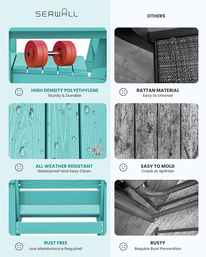 - 【Low Maintenance】HDPE dining table sets required low maintenance. Unlike the Steel dining sets may require rust prevention, SERWALL patio dining table and chairs are easy to clean with just soap and water, requiring minimal effort to keep them looking fresh.