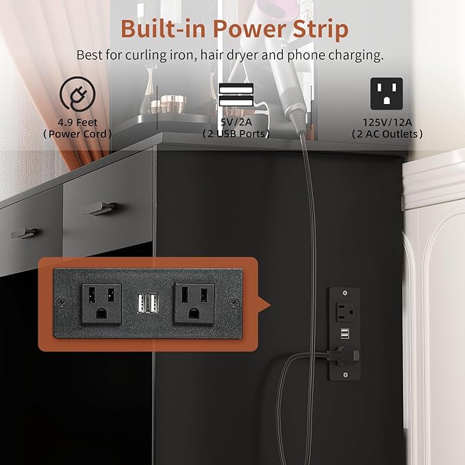 - Convenient Charging Station: Comes with 2 standard plug sockets and 2 USB ports, really convenient for hair dryer, curling iron, beauty device and phone charging, etc.