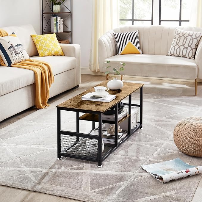 VECELO TV Stand Up to 50 Inches, 39 Inch Industrial Entertainment Center Media Console with Open Storage Shelves, Wooden Coffee Table with Metal Frame, Brown