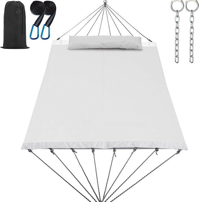 - ✅DOUBLE HAMMOCK & SPACIOUS ENOUGH TO SHARE: The comfort that comes with extra space is vital to us, and its size also boasts a wider range of versatility, allowing it to be hung from a 12-14ft hammock stand (not included) or used outdoors on its own.The hammock bed's dimension is 77" L * 57" W, the length from chain to chain is 14', larger than other quilted hammocks.