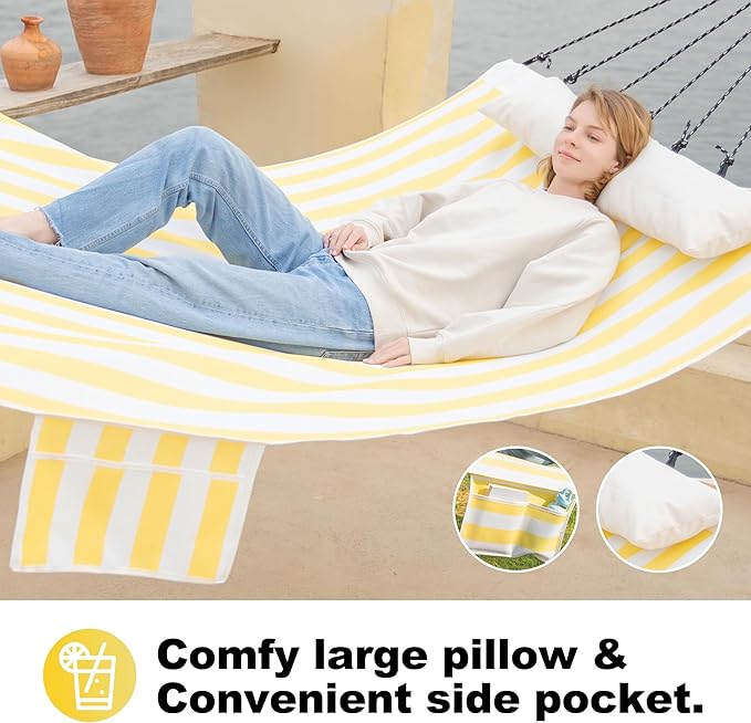 14ft Two Person Outdoor Hammock, Portable Camping with Folding Steel Spreader Bar, Carrying Bag, Carabiners, Tree Straps, Pillow & Sidebag, Quick Dry Textilene, 550 lbs Capacity (Lemon)